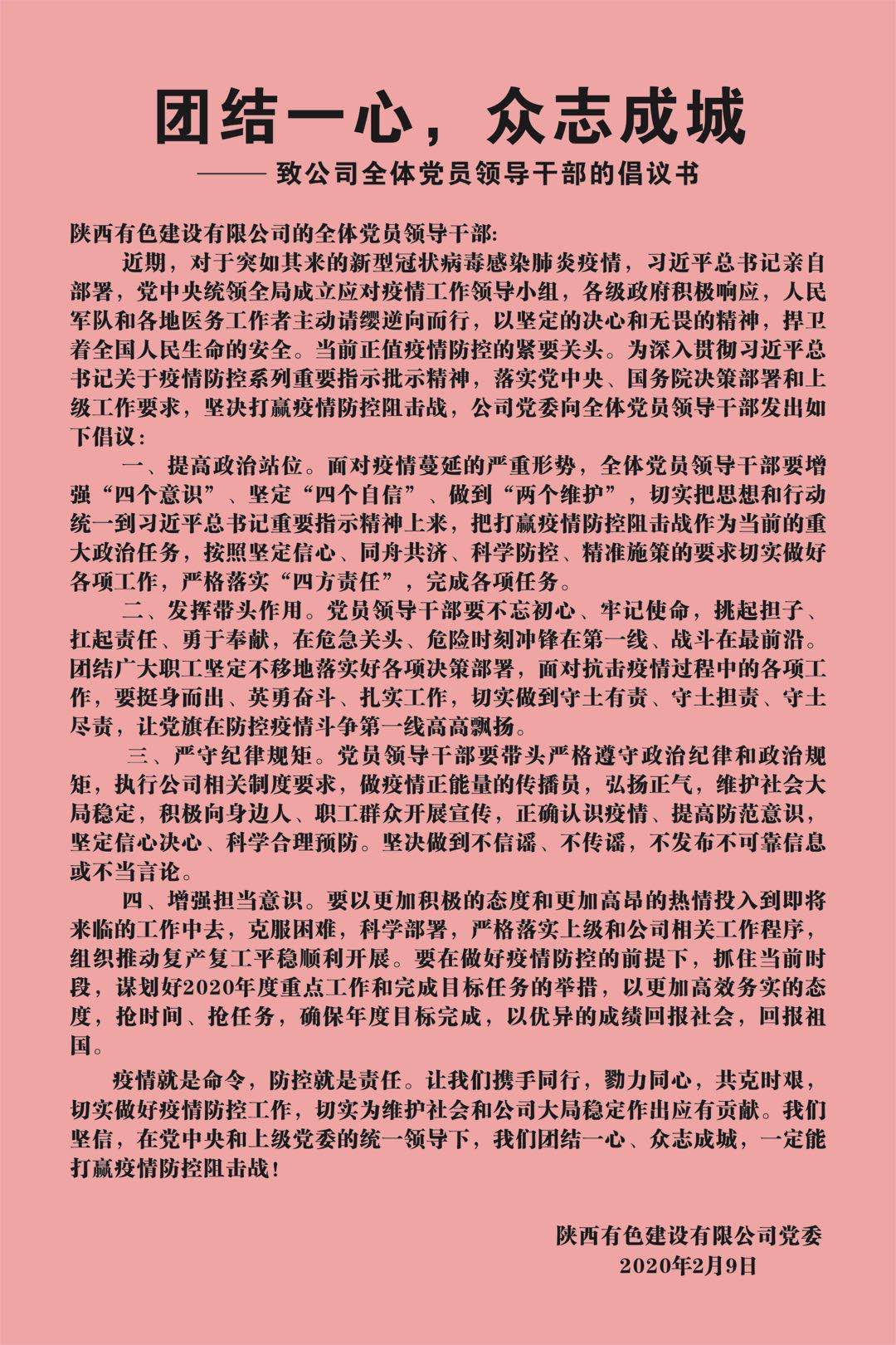 疫情就是命令、防控就是責(zé)任。近日,公司黨委發(fā)布了致公司全體黨員領(lǐng)導(dǎo)干部的倡議書,號(hào)召全體黨員干部切實(shí)提高政治站位,發(fā)揮帶頭作用,嚴(yán)守紀(jì)律規(guī)矩,增強(qiáng)擔(dān)當(dāng)意識(shí),為公司疫情防控工作和公司穩(wěn)定大局作出貢獻(xiàn)。