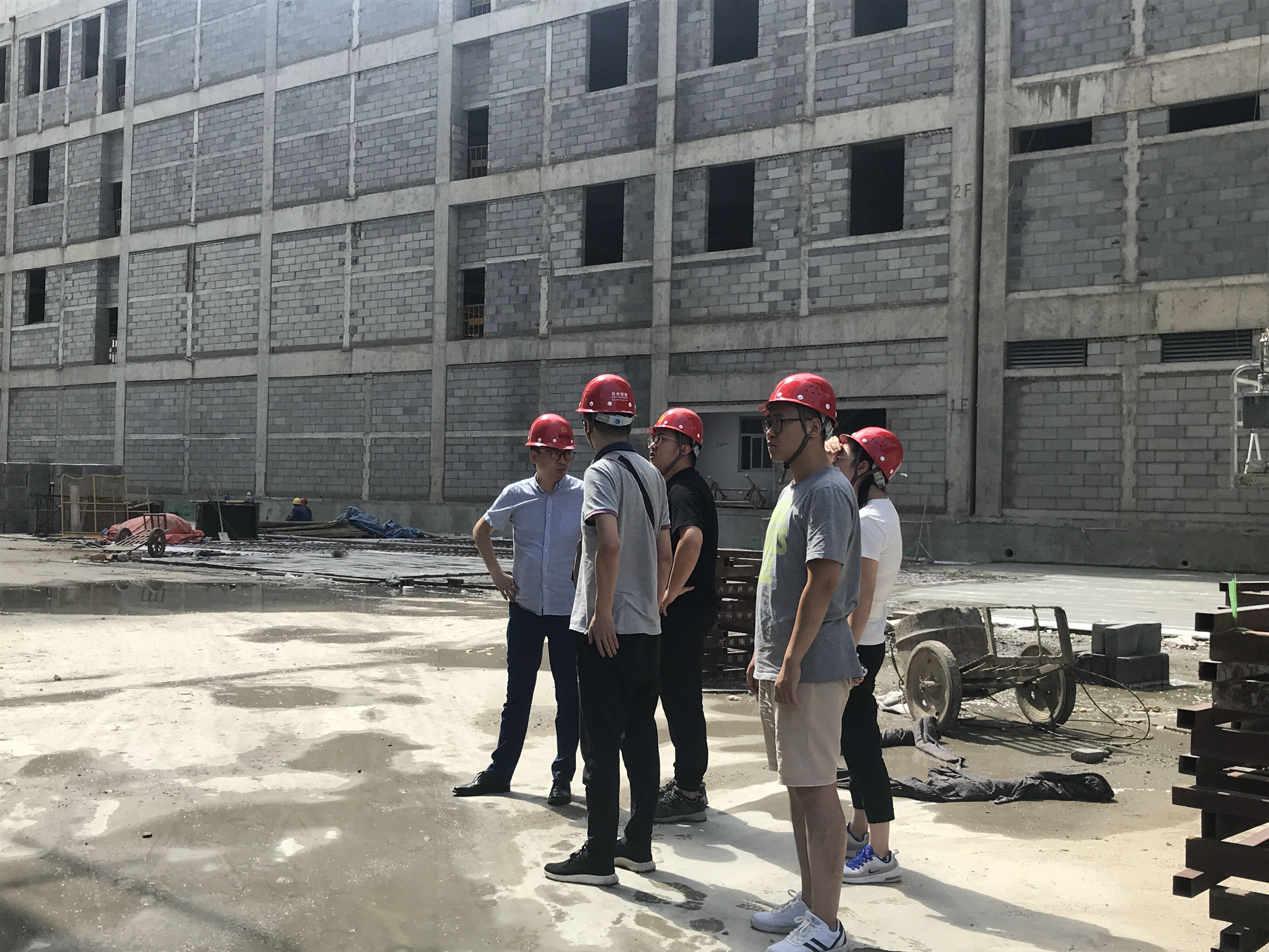 在工地現(xiàn)場,項(xiàng)目經(jīng)理呂紅輝介紹了項(xiàng)目目前的施工進(jìn)度情況?,F(xiàn)主體工程已經(jīng)完工,正在進(jìn)行防水、保溫等工作,施工現(xiàn)場井然有序,在建主樓觀感良好。大家跟隨呂經(jīng)理了解到了車庫頂板防水所用材料及其施工工藝,在標(biāo)準(zhǔn)層中進(jìn)行了實(shí)地參觀學(xué)習(xí)。