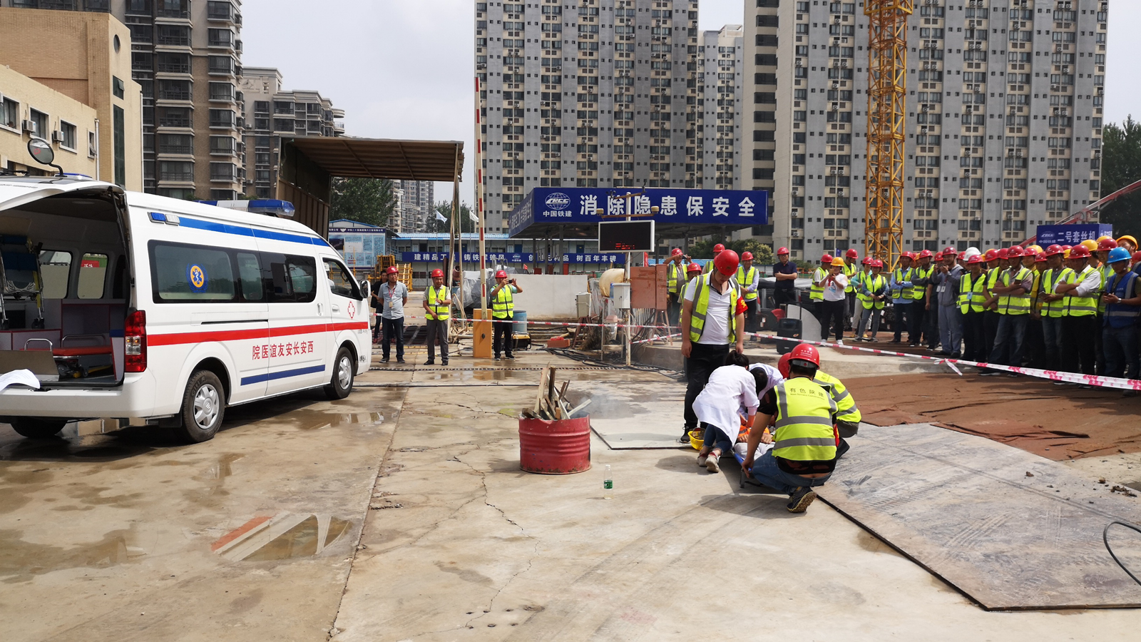 儀式結(jié)束后,項目部組織開展了消防應(yīng)急演練,項目經(jīng)理孫杰擔(dān)任應(yīng)急演練指揮,本次演練模擬因違章作業(yè),造成木工棚著火,致使施工人員燒傷并窒息。工人發(fā)現(xiàn)起火后立即進行自救,但由于火勢較大,火勢沒有得到有效控制,并在自救過程中被火燒傷,吸入大量濃煙導(dǎo)致窒息,情況較為危險。項目安全員發(fā)現(xiàn)此情況,立即報告項目經(jīng)理,項目經(jīng)理得知此事后立即啟動消防應(yīng)急預(yù)案,并組織各救援小組開展救援活動。警戒疏導(dǎo)組在發(fā)生火災(zāi)后立即對現(xiàn)場人員進行疏散,并設(shè)立警戒線,確?,F(xiàn)場人員及時逃生避免二次傷害。醫(yī)療組立即對傷員進行臨時救治,并撥打120急救電話,簡單救治后將傷員轉(zhuǎn)移至安全地帶等待救護車。救援組立即采用滅火器對現(xiàn)場火勢進行撲救,明火撲滅后對著火點進行清理。救護車達到現(xiàn)場,將傷員送至醫(yī)院進行救治。救援組待火勢完全熄滅并確認(rèn)現(xiàn)場安全后,將場地進行清理,施工現(xiàn)場恢復(fù)正常,消防演練結(jié)束。